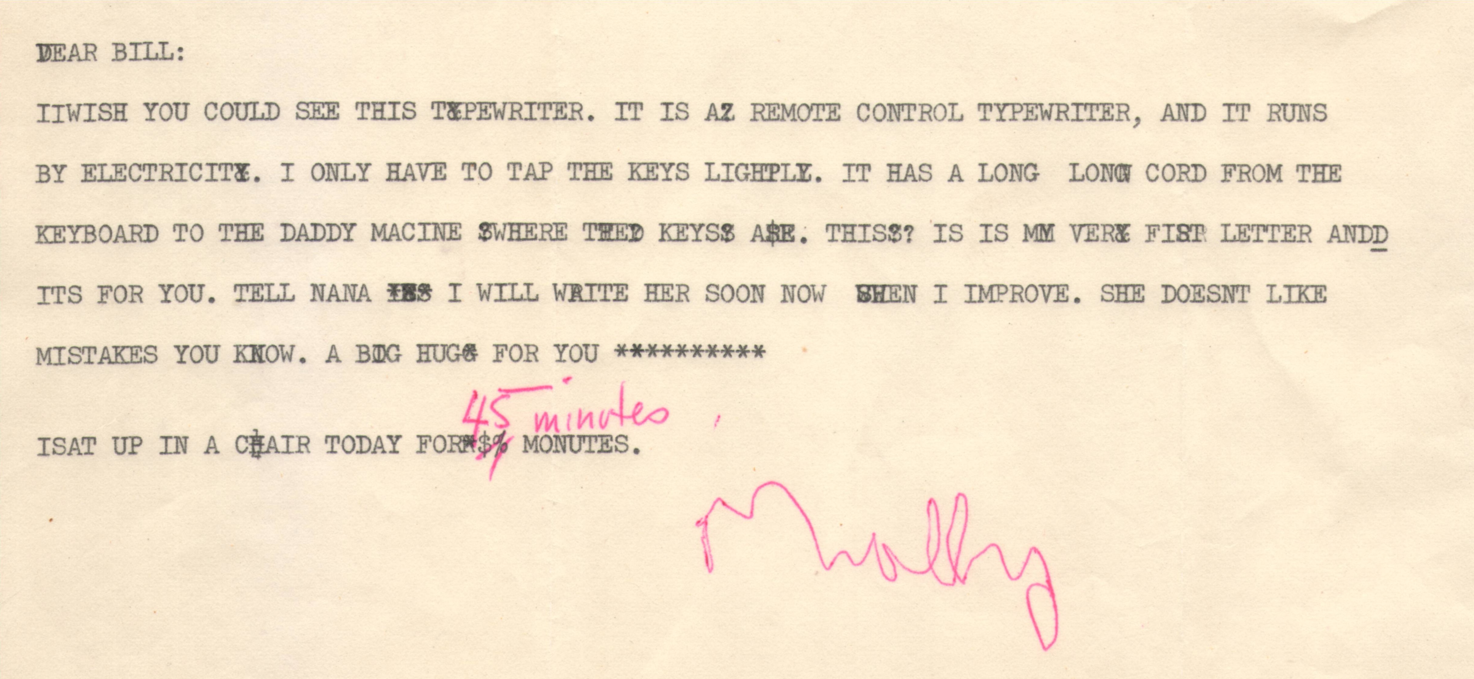 First, a 'letter' she had written on an early electric typewriter when she in rehabilitation in Warm Springs, then a center for those stricken with polio; she wrote it to my (4 years) older brother Bill. Bill and I were in the keeping of her mother and sister in Bradford, PA, and Bill would have just been able to read. It wrings my heart.