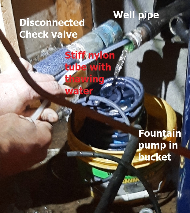 - He puts the fountain pump in the bucket, fishes the 1/4 "